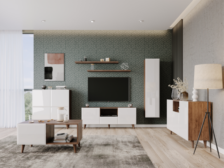 Poseduje soft-close mehanizam, jednu otvorenu policu, tri fioke i pet dekorativnih ručica